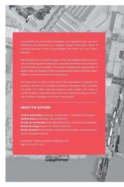 In a hackable city, new media technologies are employed to open up urban institutions and infrastructures to systemic change in the public interest. It combines top-down smart-city technologies with bottom-up 'smart citizen' initiatives. The Hackable City is a research project on the role of digital media in the process of citymaking that resulted from cooperation between One Architecture and The Mobile City Foundation. The project investigates the opportunities of digital media technologies for the empowerment of citizens and other stakeholders in a democratic process of citymaking. This book aims to offer a closer look at the implications of 'hackable city making' in the form of a Hackable City Research Manifesto and a 'hackable city toolkit'. This toolkit could give designers, policy makers and citizens a number of ideas to approach projects that they might be working on, providing also a number of strategies to include in their projects.