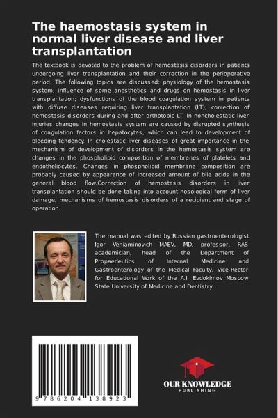 The textbook is devoted to the problem of hemostasis disorders in patients undergoing liver transplantation and their correction in the perioperative period. The following topics are discussed: physiology of the hemostasis system; influence of some anesthetics and drugs on hemostasis in liver transplantation; dysfunctions of the blood coagulation system in patients with diffuse diseases requiring liver transplantation (LT); correction of hemostasis disorders during and after orthotopic LT. In noncholestatic liver injuries changes in hemostasis system are caused by disrupted synthesis of coagulation factors in hepatocytes, which can lead to development of bleeding tendency. In cholestatic liver diseases of great importance in the mechanism of development of disorders in the hemostasis system are changes in the phospholipid composition of membranes of platelets and endotheliocytes. Changes in phospholipid membrane composition are probably caused by appearance of increased amount ofbile acids in the general blood flow.Correction of hemostasis disorders in liver transplantation should be done taking into account nosological form of liver damage, mechanisms of hemostasis disorders of a recipient and stage of operation.