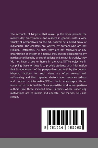 The accounts of Ninjutsu that make up this book provide the modern-day practitioners-and readers in general-with a wide variety of perspectives on the art, posited by a broad array of individuals. The chapters are written by authors who are not Ninjutsu instructors. As such, they are not followers of any organization or system of ninjutsu; they owe no allegiance to any particular philosophy or set of beliefs; and, to put it crudely, they "do not have a dog or horse in the race." The objective in compiling these writings is to provide students with information that is independent of the perspectives put forth by the popular Ninjutsu factions, for such views are often skewed and self-serving, and their repeated rhetoric soon becomes tedious and, worse, uninformative. The book encourages those interested in the Arts of the Ninja to read the work of non-partisan authors (like those included here); authors whose underlying motivations are to inform and educate-not market, sell, and recruit.