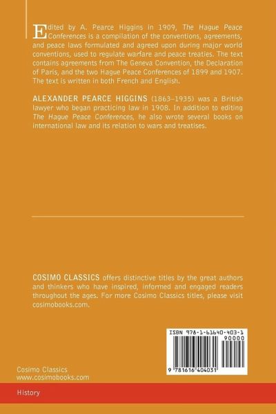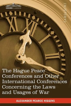 Edited by A. Pearce Higgins in 1909, The Hague Peace Conferences is a compilation of the conventions, agreements, and peace laws formulated and agreed upon during major world conventions, used to regulate warfare and peace treaties. The text contains agreements from The Geneva Convention, the Declaration of Paris, and the two Hague Peace Conferences of 1899 and 1907. The text is written in both French and English. ALEXANDER PEARCE HIGGINS (1863-1935) was a British lawyer who began practicing law in 1908. In addition to editing The Hague Peace Conferences, he also wrote several books on international law and its relation to wars and treatises.