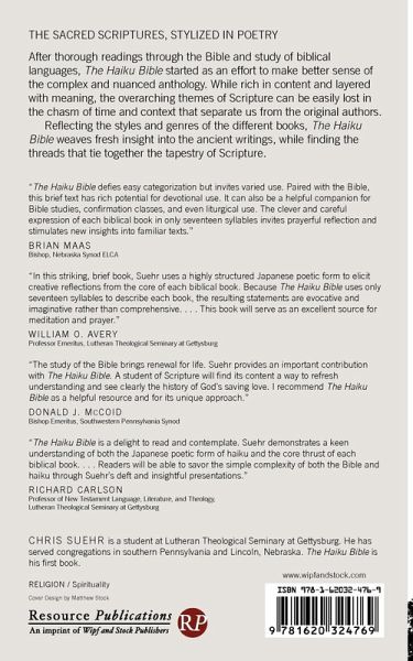 The sacred Scriptures, stylized in poetry After thorough readings through the Bible and study of biblical languages, The Haiku Bible started as an effort to make better sense of the complex and nuanced anthology. While rich in content and layered with meaning, the overarching themes of Scripture can be easily lost in the chasm of time and context that separate us from the original authors. Reflecting the styles and genres of the different books, The Haiku Bible weaves fresh insight into the ancient writings, while finding the threads that tie together the tapestry of Scripture.
