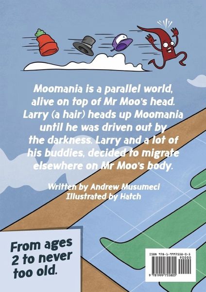 Mr Moo is a young man enjoying an adventurous life of surfing and skateboarding. In parallel, Larry (who's a hair) alive on top of Mr Moo's head is also enjoying the same fun-filled life. Larry and all of his buddies are personified as individual characters and they call their world Moomania. Both Mr Moo and Larry in Moomania are enjoying their lives until one day, Mr Moo started wearing hats every single day. Outdoors, indoors, doing the chores - there was a new hat for this and that. Larry and his friends rallied and decided they'd had enough of Mr Moo's hat hobby and decided to move elsewhere on Mr Moo's body. The journey was fun and racus. Some decided to stay near and popped into Mr Moo's ears. Some wanted to farm on Mr Moo's arms. And Larry chose to open a Jelly Deli on Mr Moo's belly. Many hairs decided to make the move south - settling all over Mr Moo's body. Larry grew older, had a family and eventually retired to the Bingo Halls where he gracefully turned grey. This story subtly looks at the transition into manhood. As you get older, a lot of us lads start to lose hair where we'd like to keep it and gain hair in all sorts of places we'd prefer not to have it. From a child's perspective, it poses the idea that all our hairs are alive - they can speak and have feelings. From an adult's perspective, it's a truth - us lads gain hairs all over our body as we grow older. Hairs seem to pop up all over the place. The story is lighthearted and makes this process feel normal and natural - these hairs should be there. There's no shame in having hairs.