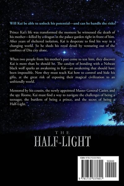 Will Kai be able to unlock his potential-and can he handle the risks? Prince Kai's life was transformed the moment he witnessed the death of his mother-killed by a dragon in the palace garden right in front of him. After years of sheltered isolation, Kai is desperate to find his way in a changing world. So he sheds his royal detail by venturing out of the confines of Diu city alone. When two people from his mother's past come to test him, they discover Kai is more than he should be. The catalyst of bonding with a Nebean black wolf sparks an awakening in Kai-an awakening that should have been impossible. Now they must teach Kai how to control and hide his gifts, at the great risk of exposing their magical civilization to an unfriendly world. Mentored by his cousin, the newly appointed Master General Cazier, and the spy Riome, Kai must find a way to navigate the challenges of being a teenager, the burdens of being a prince, and the secret of being a Half-Light.