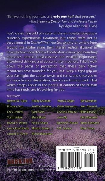 "Believe nothing you hear, and only one half that you see." -The System of Dr. Tarr and Prof. Fether by Edgar Allan Poe (1845) Poe's classic tale told of a state of the art hospital boasting a curiously experimental treatment, but things were not as they seemed. In The Half That You See, twenty-six writers from around the globe share their literary optical illusions in never before seen stories of portentous visions and haunting memories, altered consciousness and virulent nightmares, disordered thinking and descents into madness. Take a walk down the paths of perception that these dark fiction raconteurs have tunneled for you, but keep a tight grip on your flashlight: the course twists and turns, and once you're on route to your destination, there is no turning back. That which creeps about in the poorly lit corners of the human mind has teeth, and it's waiting for you. Featuring: Michael W. Clark Holley Cornetto Victoria Dalpe Bill Davidson Douglas Ford Justine Gardner Eddie Generous Alex Giannini Kelly Griffiths Sam Hicks Luciano Marano Matt Masucci Scotty Milder Mack Moyer Lena Ng Elin Olausson Robert P. Ottone Felice Picano Edward R. Rosick Susie Schwartz Mahlon Smoke Laura Saint Martin T.M. Starnes Mark Towse Lamont A. Turner Nicole Wolverton