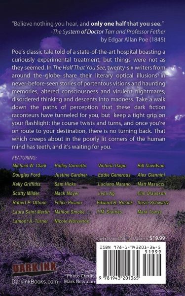 "Believe nothing you hear, and only one half that you see." -The System of Dr. Tarr and Prof. Fether by Edgar Allan Poe (1845) Poe's classic tale told of a state of the art hospital boasting a curiously experimental treatment, but things were not as they seemed. In The Half That You See, twenty-six writers from around the globe share their literary optical illusions in never before seen stories of portentous visions and haunting memories, altered consciousness and virulent nightmares, disordered thinking and descents into madness. Take a walk down the paths of perception that these dark fiction raconteurs have tunneled for you, but keep a tight grip on your flashlight: the course twists and turns, and once you're on route to your destination, there is no turning back. That which creeps about in the poorly lit corners of the human mind has teeth, and it's waiting for you. Featuring: Michael W. Clark Holley Cornetto Victoria Dalpe Bill Davidson Douglas Ford Justine Gardner Eddie Generous Alex Giannini Kelly Griffiths Sam Hicks Luciano Marano Matt Masucci Scotty Milder Mack Moyer Lena Ng Elin Olausson Robert P. Ottone Felice Picano Edward R. Rosick Susie Schwartz Mahlon Smoke Laura Saint Martin T.M. Starnes Mark Towse Lamont A. Turner Nicole Wolverton
