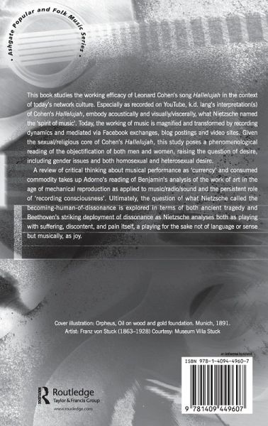 This book studies the working efficacy of Leonard Cohen's song Hallelujah in the context of today's network culture. Especially as recorded on YouTube, k.d. lang's interpretation(s) of Cohen's Hallelujah, embody acoustically and visually/viscerally, what Nietzsche named the 'spirit of music'. Today, the working of music is magnified and transformed by recording dynamics and mediated via Facebook exchanges, blog postings and video sites. Given the sexual/religious core of Cohen's Hallelujah, this study poses a phenomenological reading of the objectification of both men and women, raising the question of desire, including gender issues and both homosexual and heterosexual desire. A review of critical thinking about musical performance as 'currency' and consumed commodity takes up Adorno's reading of Benjamin's analysis of the work of art in the age of mechanical reproduction as applied to music/radio/sound and the persistent role of 'recording consciousness'. Ultimately, the question of what Nietzsche called the becoming-human-of-dissonance is explored in terms of both ancient tragedy and Beethoven's striking deployment of dissonance as Nietzsche analyses both as playing with suffering, discontent, and pain itself, a playing for the sake not of language or sense but musically, as joy.