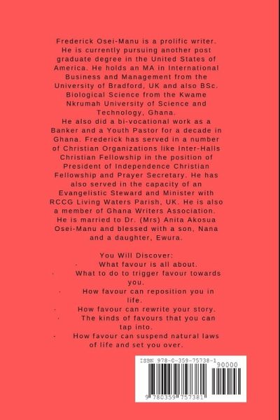 You Will Discover: ¿ What favour is all about. ¿ What to do to trigger favour towards you. ¿ How favour can reposition you in life. ¿ How favour can rewrite your story. ¿ The kinds of favours that you can tap into. ¿ How favour can suspend natural laws of life and set you over.