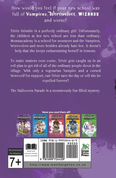 Awarded the LoveReading4Kids "Indie Books We Love" award. Winner of a Readers' Favorite 5 Star Award. A new school, new friends and monsters for classmates. Joining a new school is hard for any child. When Trixie Grimble joins a school for monsters, her problems are only just beginning. She soon realises that she’s going to have to make some adjustments if she’s going to fit in at Monstacademy. There’s a big event on the horizon and one of the monsters is plotting to take over the world. Trixie only has a cursed werewolf and a vegetarian vampire to help her. Will they stop him in time? Whatever happens, Trixie and her friends need to make sure that the school stays open and the Halloween Parade goes off without a hitch. Readers are loving this exciting and hilarious adventure that tackles the problems all children face when moving to a new school. "I wish more books like this had been around when I was a child, it would have made reading even better and more imaginative. A character like Trixie would have been a great read as a child and was also a very cute and loving character to read as an adult." - Belle and the Novel "This was a really fun read and I can imagine it being a story that is loved and read over and over - it certainly has some brilliant quirky characters!" - Donna's Book Blog "From a parents point of view I liked that the book showed that we can all be different but all feel the same when we are left out, made fun of or are bullied." - Orchard Book Club's Mini Reviewers "I may be an adult, but I still found myself snorting with laughter at the humour, and the snippets that I read out to my class had them giggling away and roaring with laughter." - The Bookish Fairy "[My daughter] read it through in one evening and there was complete joy and laughter that could be heard through the ceiling to my office below. She loved the story." - Girl Who Sciences The Monstacademy series books are also available in dyslexia-adapted paperback editions.