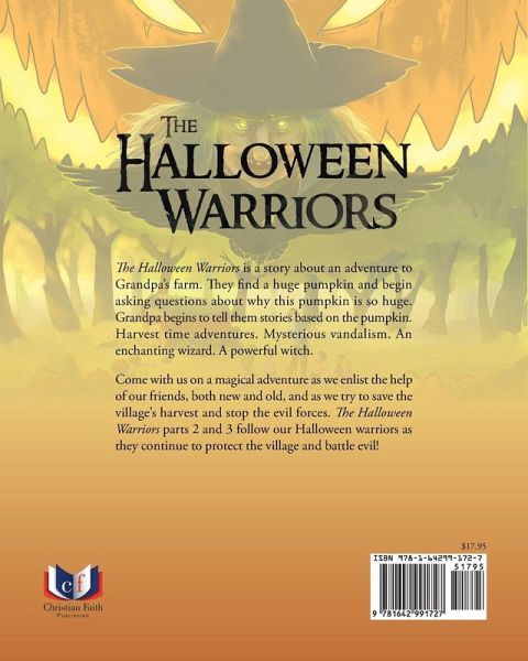 Back cover summary The Halloween Warriors is a story about an adventure to Grandpa's farm. They find a huge pumpkin and begin asking questions about why this pumpkin is so huge. Grandpa begins to tell them stories based on the pumpkin. Harvest time adventures. Mysterious vandalism. An enchanting wizard. A powerful witch. Come with us on a magical adventure as we enlist the help of our friends, both new and old, and as we try to save the village's harvest and stop the evil forces. The Halloween Warriors parts 2 and 3 follow our Halloween warriors as they continue to protect the village and battle evil!