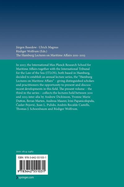 Part I: The Hamburg Lectures 2011: Preservation of the Marine Environment by Rüdiger Wolfrum.- An Evaluation of the Rotterdam Rules by Thomas J. Schoenbaum.- Reflections on Spain's Decision to Ratify the Rotterdam Rules by Andrés Recalde Castells.- Territory in the Rome I and Rome II Regulations by Andrew Dickinson.- Part II: The Hamburg Lectures 2012: Transnational Maritime Law by Andreas Maurer.- Jurisdiction of States over Persons at Sea: Principles, Issues, Consequences by Irini Papanicolopulu.- Current Issues Regarding the Delimitation of the Outer Continental Shelf - A Panel Discussion in the International Tribunal for the Law of the Sea (30 September 2012) by Chris Carleton, Philippe Gautier, Vladimir Golitsyn, Michael Lodge and Shunji Yanai.- Article 47(2) of the Rotterdam Rules: The Solution of Old Problems or a New Confusion? By Caslav Pejovic.- Cruise Ship Law by Juan L. Pulido.- Part III: The Hamburg Lectures 2013: SOLAS Article VII and Pacific Island Passenger Services by Bevan Marten.- Gunslingers on the High Seas: A Call for Regulation by Yvonne M. Dutton.