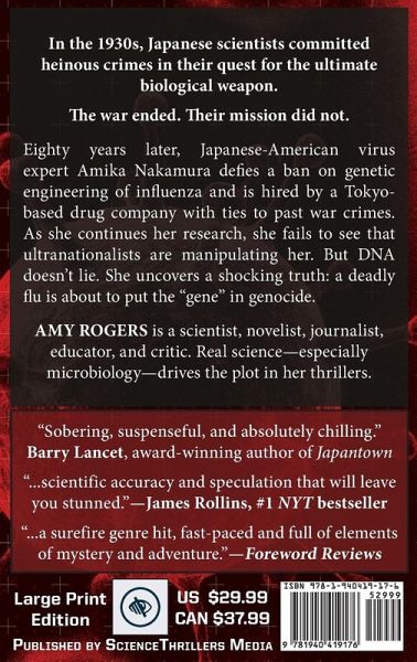 LARGE PRINT EDITION 18-point type **Foreword INDIES Book of the Year Awards Finalist** Modern biotechnology propels an ancient ethnic rivalry to a terrifying new level… In the 1930s, Japanese scientists in China committed heinous crimes in their quest for the ultimate biological weapon. The war ended. Their mission did not. Eighty years later, Japanese-American scientist Amika Nakamura won't let rules stand between her and scientific glory. When the ambitious young virologist defies a ban on the genetic manipulation of influenza, she's expelled from the university. Desperate to save her career, she accepts a position with a pharmaceutical company in Tokyo. Soon after, a visit to a disputed island entangles her in a high-profile geopolitical struggle between Japan and China. Applying her singular expertise with bird flu in a risky experiment may be the only way out. Little does she know that Japanese ultra-nationalists and a legacy of unpunished war crimes lurk in the shadows, manipulating people, politics, and science. But DNA doesn't lie. Amika uncovers a shocking truth: a deadly virus is about to put the "gene" in genocide. Praise for THE HAN AGENT: "Amy Rogers's latest medical thriller is as exciting as it is frighteningly realistic. It could be tomorrow's headline. Here is a story fraught with tension, and threaded through with scientific accuracy and speculation that will leave you stunned."-James Rollins, #1 New York Times bestselling author of Sigma Force series "In a stunning 'what-if' author-scientist Amy Rogers resurrects the idea of Unit 731, Japan's notorious wartime biological weapons division, weaving together a diabolical tale of science, genocide, and modern-day bio-terror. Sobering, suspenseful, and absolutely chilling."-Barry Lancet, award-winning author of The Spy Across the Table and Tokyo Kill "In this gripping thriller by Amy Rogers, World War II-era history, ultranationalism, and biological genocide intertwine.The Han Agent is a surefire genre hit, fast-paced and full of elements of mystery and adventure. Science fiction hounds in particular will dig the information about DNA sequencing, virus detection, and how plagues can spread." -Foreword Reviews magazine "The Han Agent will get your heart pounding and your blood boiling. Putting huge swaths of humanity in its crosshairs, this pressure cooker of a thriller portrays with chilling realism how individuals can use specialized scientific knowledge for good or evil."-J.E. Fishman, bestselling author of Primacy and the Bomb Squad NYC series
