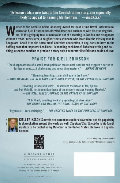 "Eriksson adds a new twist to the Swedish crime story, one especially likely to appeal to Henning Mankell fans." --Booklist Winner of the Swedish Crime Academy Award for Best Novel, international sensation Kjell Eriksson has dazzled American audiences with his stunning thrillers. In this gripping tale, a man walks out of a meeting in Sweden and disappears without a trace. Years later, a neighbor spots someone who looks like the missing man in Bangalore. Could it be the same man? And what connection, if any, does he have to the baffling case that Inspector Ann Lindell is handling back home? Fabulous writing and nail-biting suspense combine in The Hand that Trembles to produce a story only a superstar like Eriksson could achieve.