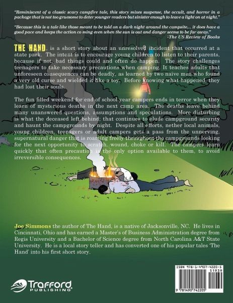 "The Hand" is a short story about an unresolved severed-hand incident that occurred at a state campsite in the early '90s. This story is mostly true and entertaining, while encouraging young children to listen to their parents while camping, because if not, bad things could happen. The story challenges teenagers to take precautions and to ensure their safety when camping, and it teaches adults that unforeseen consequences can be deadly, as learned from two naive men who found a very old curse and wielded it like a toy. Before knowing what had happened, they had lost their souls. The fun filled weekend for end of school year campers ends in terror when they learn of mysterious deaths in the next camp area. The deaths leave behind many unanswered questions, assumptions and speculations. More disturbing is what the deceased left behind; that continues to elude campground security and haunt the campgrounds by night. Despite all efforts, nether local animals, young children, teenagers or adult campers gets a pass from the unnerving, supernatural danger that is roaming freely throughout the campgrounds looking for the next opportunity to scratch, wound, choke or kill. The campers learn quickly that often precaution is the only option available to them, to avoid irreversible consequences.