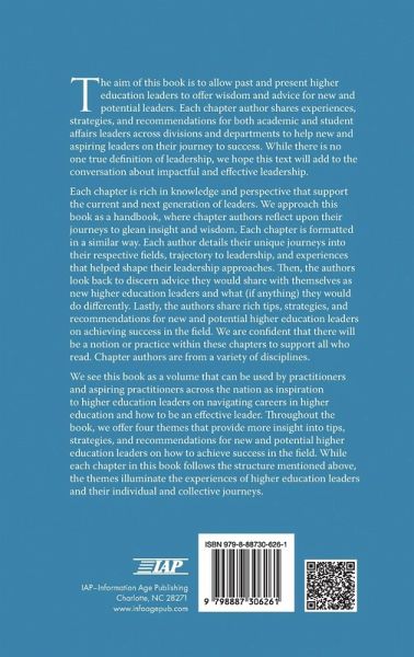 The aim of this book is to allow past and present higher education leaders to offer wisdom and advice for new and potential leaders. Each chapter author shares experiences, strategies, and recommendations for both academic and student affairs leaders across divisions and departments to help new and aspiring leaders on their journey to success. While there is no one true definition of leadership, we hope this text will add to the conversation about impactful and effective leadership. Each chapter is rich in knowledge and perspective that support the current and next generation of leaders. We approach this book as a handbook, where chapter authors reflect upon their journeys to glean insight and wisdom. Each chapter is formatted in a similar way. Each author details their unique journeys into their respective fields, trajectory to leadership, and experiences that helped shape their leadership approaches. Then, the authors look back to discern advice they would share with themselves as new higher education leaders and what (if anything) they would do differently. Lastly, the authors share rich tips, strategies, and recommendations for new and potential higher education leaders on achieving success in the field. We are confident that there will be a notion or practice within these chapters to support all who read. Chapter authors are from a variety of disciplines. We see this book as a volume that can be used by practitioners and aspiring practitioners across the nation as inspiration to higher education leaders on navigating careers in higher education and how to be an effective leader. Throughout the book, we offer four themes that provide more insight into tips, strategies, and recommendations for new and potential higher education leaders on how to achieve success in the field. While each chapter in this book follows the structure mentioned above, the themes illuminate the experiences of higher education leaders and their individual and collective journeys.