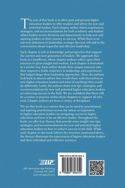 The aim of this book is to allow past and present higher education leaders to offer wisdom and advice for new and potential leaders. Each chapter author shares experiences, strategies, and recommendations for both academic and student affairs leaders across divisions and departments to help new and aspiring leaders on their journey to success. While there is no one true definition of leadership, we hope this text will add to the conversation about impactful and effective leadership. Each chapter is rich in knowledge and perspective that support the current and next generation of leaders. We approach this book as a handbook, where chapter authors reflect upon their journeys to glean insight and wisdom. Each chapter is formatted in a similar way. Each author details their unique journeys into their respective fields, trajectory to leadership, and experiences that helped shape their leadership approaches. Then, the authors look back to discern advice they would share with themselves as new higher education leaders and what (if anything) they would do differently. Lastly, the authors share rich tips, strategies, and recommendations for new and potential higher education leaders on achieving success in the field. We are confident that there will be a notion or practice within these chapters to support all who read. Chapter authors are from a variety of disciplines. We see this book as a volume that can be used by practitioners and aspiring practitioners across the nation as inspiration to higher education leaders on navigating careers in higher education and how to be an effective leader. Throughout the book, we offer four themes that provide more insight into tips, strategies, and recommendations for new and potential higher education leaders on how to achieve success in the field. While each chapter in this book follows the structure mentioned above, the themes illuminate the experiences of higher education leaders and their individual and collective journeys.