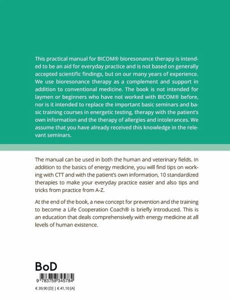This practical manual for BICOM® bioresonance therapy is intended to be an aid for everyday practice and is not based on generally accepted scientific findings, but on our many years of experience. We use bioresonance therapy as a complement and support in addition to conventional medicine. The book is not intended for laymen or beginners who have not worked with BICOM® before, nor is it intended to replace the important basic seminars and basic training courses in energetic testing, therapy with the patient's own information and the therapy of allergies and intolerances. We assume that you have already received this knowledge in the relevant seminars. The manual can be used in both the human and veterinary fields. In addition to the basics of energy medicine, you will find tips on working with CTT and with the patient's own information, 10 standardised basic classifications to make your everyday practice easier and also tips and tricks from practice from A-Z.At the end of the book, a new concept for prevention and the training to become a Life Cooperation Coach® is briefly introduced. This is an education that deals comprehensively with energy medicine at all levels of human existence.