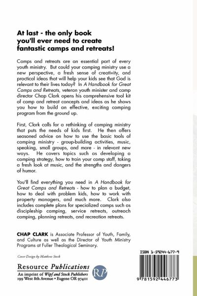 Camps and retreats are an essential part of every youth ministry. But could your camping ministry use a new perspective, a fresh sense of creativity, and practical ideas that will help your kids see that God is relevant to their lives today? In 'The Youth Specialties Handbook for Great Camps and Retreats', veteran youth minister and camp director Chap Clark opens his comprehensive tool kit of camp and retreat concepts and ideas as he shows you how to build an effective, exciting camping program from the ground up. First, Clark calls for a rethinking of camping ministry that puts the needs of kids first. He then offers seasoned advice on how to use the basic tools of camping ministry - group-building activities, music, speaking, small groups, and more - in relevant new ways. He covers topics such as developing a camping strategy, how to train your camp staff, taking a fresh look at music, and the strengths and dangers of humor. You'll find everything you need in 'The Youth Specialties Handbook for Great Camps and Retreats' - how to plan a budget, how to deal with problem kids, how to work with property managers, and much more. Clark also includes complete plans for specialized camps such as discipleship camping, service retreats, outreach camping, planning retreats, and recreation retreats.
