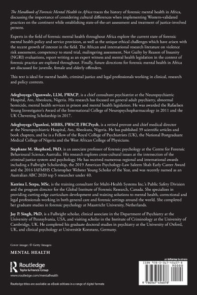 Adegboyega Ogunwale, LLM, FWACP, is a chief consultant psychiatrist at the Neuropsychiatric Hospital, Aro, Abeokuta, Nigeria. His research has focused on general adult psychiatry, abnormal homicide, mental health services in prison and mental health legislation. He was awarded the Rafaelsen Young Investigator's Award of the International College of Neuropsychopharmacology in 2011 and the UK Chevening Scholarship in 2017. Adegboyega Ogunlesi, MBBS, FWACP, FRCPsych, is a retired provost and chief medical director at the Neuropsychiatric Hospital, Aro, Abeokuta, Nigeria. He has published 39 scientific articles and book chapters, and he is a Fellow of the Royal College of Psychiatrists (UK), the National Postgraduate Medical College of Nigeria and the West African College of Physicians. Stephane M. Shepherd, PhD, is an associate professor of forensic psychology at the Centre for Forensic Behavioural Science, Australia. His research explores cross-cultural issues at the intersection of the criminal justice system and psychology. He has received numerous regional and international awards including a Fulbright Scholarship, the 2019 American Psychology-Law Saleem Shah Early Career Award and the 2016 IAFMHS Christopher Webster Young Scholar of the Year, and was recently named as an Australian ABC 2020 top 5 researcher under 40. Katrina I. Serpa, MSc, is the training consultant for Multi-Health Systems Inc.'s Public Safety Division and the program director for the Global Institute of Forensic Research, Canada. She specializes in providing cutting-edge curriculum development and training solutions to mental health, correctional, and legal professionals working in both general care and forensic settings around the world. She completed her graduate studies in forensic psychology at Maastricht University, Netherlands. Jay P. Singh, PhD, is a Fulbright scholar, clinical associate in the Department of Psychiatry at the University of Pennsylvania, USA, and visiting scholar in the Institute of Criminology at the University of Cambridge, UK. He completed his graduate doctoral studies in psychiatry at the University of Oxford, UK, and clinical psychology at Universität Konstanz, Germany.