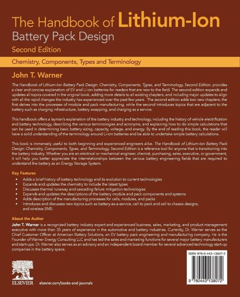 The Handbook of Lithium-Ion Battery Pack Design: Chemistry, Components, Types, and Terminology, Second Edition, provides a clear and concise explanation of EV and Li-ion batteries for readers that are new to the field. The second edition expands and updates all topics covered in the original book, adding more details to all existing chapters, and including major updates to align with all the rapid changes the industry has experienced over the past few years. The second edition adds two new chapters; the first delves into the processes of module and pack manufacturing, while the second introduces topics that are adjacent to the battery such as charging infrastructure, battery swapping, and charging as a service. This handbook offers a layman's explanation of the battery industry and technology, including the history of vehicle electrification and battery technology, describing the various terminologies and acronyms, and explaining how to do simple calculations that can be used in determining basic battery sizing, capacity, voltage, and energy. By the end of reading this book, the reader will have a solid understanding of the terminology around Li-ion batteries and be able to undertake simple battery calculations. This book is immensely useful to both beginning and experienced engineers alike. The Handbook of Lithium-Ion Battery Pack Design: Chemistry, Components, Types, and Terminology, Second Edition is a reference tool for anyone that is transitioning into the battery industry. Whether you are an electrical or mechanical engineer, chemist, purchasing, sales, executive, or government, it will help you better appreciate the interrelationships between the various battery engineering fields that are required to understand the battery as an Energy Storage System.