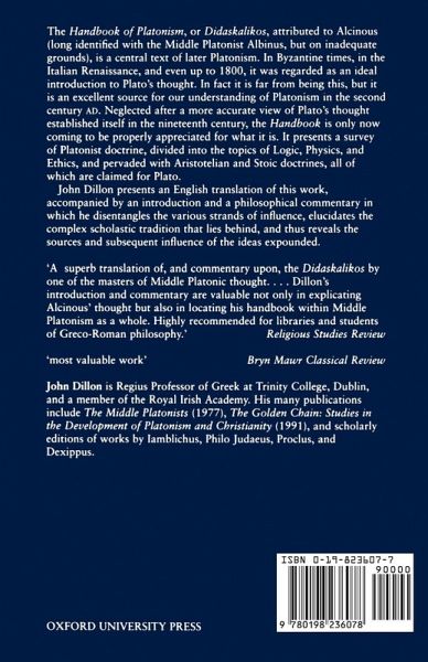 The Handbook of Platonism or Didaskalikos, attributed to Alcinous (long identified with the Middle Platonist Albinus, but on inadequate grounds), is a central text of later Platonism. In Byzantine times, in the Italian Renaissance, and even up to 1800, it was regarded as an ideal introduction to Plato's thought. In fact it is far from being this, but it is an excellent source for our understanding of Platonism in the second century AD. Neglected after a more accurate view of Plato's thought established itself in the nineteenth century, the Handbook is only now coming to be properly appreciated for what it is.It presents a survey of Platonist doctrine, divided into the topics of Logic, Physics, and Ethics, and pervaded with Aristotelian and Stoic doctrines, all of which are claimed for Plato. John Dillon presents an English translation of this work, accompanied by an introduction and a philosophical commentary in which he disentangles the various strands of influence, elucidates the complex scholastic tradition that lies behind, and thus reveals the sources and subsequent influence of the ideas expounded.