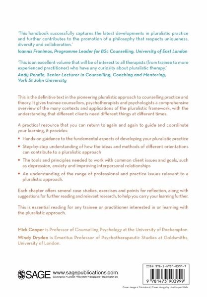 A practical resource that your students can return to again and again to guide and coordinate their pluralistic practice, it provides: Hands-on guidance to developing pluralistic practice: providing the tools, skills and practice frameworks A step-by-step understanding of how the ideas and methods of different orientations can contribute towards a pluralistic way of working The tools and understandings needed to work with clients to achieve the most common goals The tools and understandings needed to work with clients wishing to address particular issues such as depression, anxiety, addiction, health issues, suicidal thoughts An understanding of a range of professional and practice issues relevant to pluralistic practitioners. Each chapter offers definitions of key terms, several case studies, exercises and points for reflection, further reading, chapter introductions and summaries of key learning points, and overviews of relevant research.