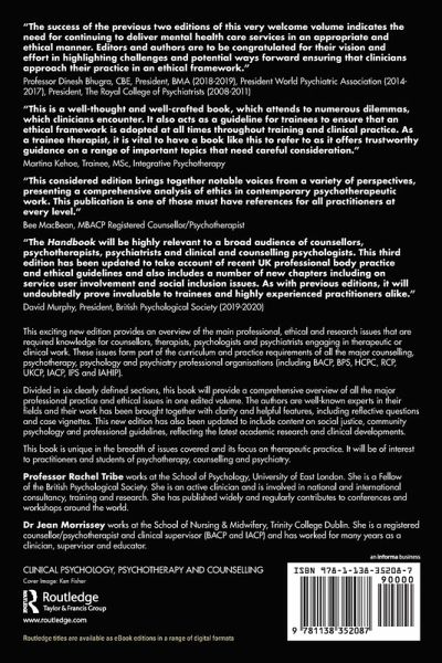 This exciting new edition provides an overview of the main professional, ethical and research issues that are required knowledge for counsellors, therapists, psychologists and psychiatrists engaging in therapeutic or clinical work. These issues form part of the curriculum and practice requirements of all the major counselling, psychotherapy, psychology and psychiatry professional organisations (including BACP, BPS, HCPC, RCP, UKCP, IACP, IPS and IAHIP).