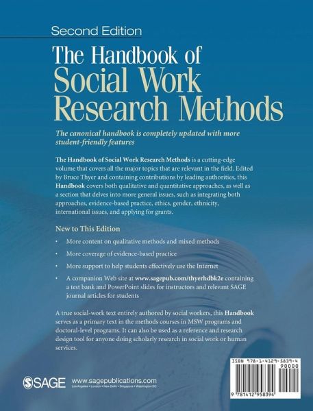 Click on the Supplements tab above for further details on the different versions of SPSS programs. The canonical Handbook is completely updated with more student-friendly features The Handbook of Social Work Research Methods is a cutting-edge volume that covers all the major topics that are relevant for Social Work Research methods. Edited by Bruce Thyer and containing contributions by leading authorities, this Handbook covers both qualitative and quantitative approaches as well as a section that delves into more general issues such as evidence based practice, ethics, gender, ethnicity,…mehr