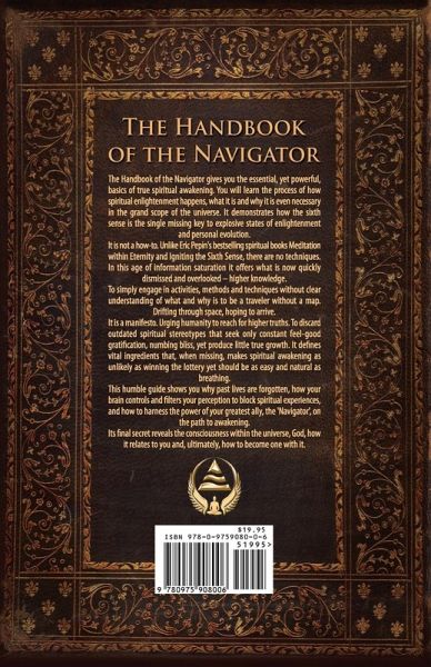 The Handbook of the Navigator breaks all the traditional rules regarding the soul, the universe, and ultimately what we consider God to be. Its scale is epic in scope, beginning with why some people feel a spiritual calling, like a secret, inner instinct that leads them to the path of awakening. How the sixth sense can directly plug you into real spiritual experiences, the creation of God, and what is the mystical state called Multi-Dimensional Consciousness (where you can be aware of multiple dimensions in your waking state) and more. It demonstrates how paranormal phenomena, metaphysics, and spiritual discovery are all combined for true awakening. If you have ever felt there was a greater purpose or meaning to your life, if you have felt a calling but could not understand what it was - this is the Navigator. This book helps you understand and connect to the Navigator and reveals why some human beings are destined to ultimately seek it out. It provides the missing link to your own personal revelation and awakening.