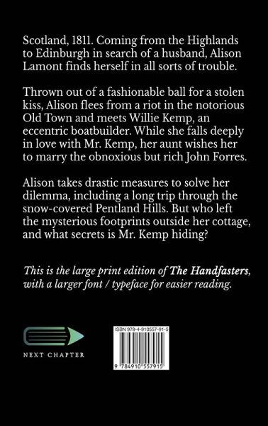 Scotland, 1811. Coming from the Highlands to Edinburgh in search of a husband, Alison Lamont finds herself in all sorts of trouble. Thrown out of a fashionable ball for a stolen kiss, Alison flees from a riot in the notorious Old Town and meets Willie Kemp, an eccentric boatbuilder. While she falls deeply in love with Mr. Kemp, her aunt wishes her to marry the obnoxious but rich John Forres. Alison takes drastic measures to solve her dilemma, including a long trip through the snow-covered Pentland Hills. But who left the mysterious footprints outside her cottage, and what secrets is Mr. Kemp hiding? This is the large print edition of The Handfasters, with a larger font / typeface for easier reading.
