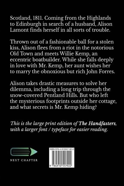 Scotland, 1811. Coming from the Highlands to Edinburgh in search of a husband, Alison Lamont finds herself in all sorts of trouble. Thrown out of a fashionable ball for a stolen kiss, Alison flees from a riot in the notorious Old Town and meets Willie Kemp, an eccentric boatbuilder. While she falls deeply in love with Mr. Kemp, her aunt wishes her to marry the obnoxious but rich John Forres. Alison takes drastic measures to solve her dilemma, including a long trip through the snow-covered Pentland Hills. But who left the mysterious footprints outside her cottage, and what secrets is Mr. Kemp hiding? This is the large print edition of The Handfasters, with a larger font / typeface for easier reading.