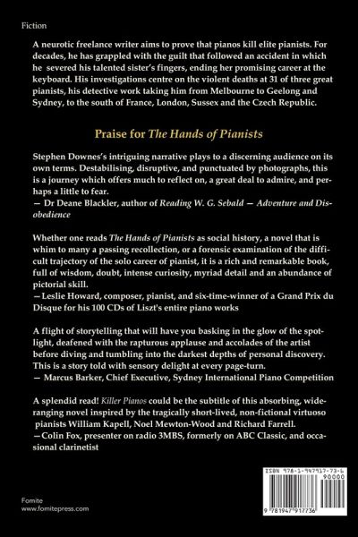 The Hands of Pianist's narrator is a neurotic freelance writer who aims to prove that pianos kill elite pianists. For decades, he has grappled with the guilt that followed an accident in which he severed his talented sister's fingers, ending her promising career at the keyboard. His investigations centre on the violent deaths at 31 of three great pianists, his detective work taking him from Melbourne to Geelong and Sydney, to the south of France, London, Sussex and the Czech Republic.