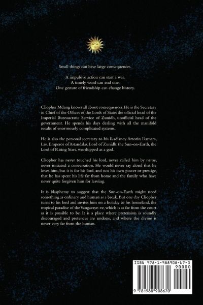 An impulsive word can start a war. A timely word can stop one. A simple act of friendship can change the course of history. Cliopher Mdang is the personal secretary of the Last Emperor of Astandalas, the Lord of Rising Stars, the Lord Magus of Zunidh, the Sun-on-Earth, the god. He has spent more time with the Emperor of Astandalas than any other person. He has never once touched his lord. He has never called him by name. He has never initiated a conversation. One day Cliopher invites the Sun-on-Earth home to the proverbially remote Vangavaye-ve for a holiday. The mere invitation could have seen Cliopher executed for blasphemy. The acceptance upends the world. ¿Lays of the Hearth-Fire ¿#1.
