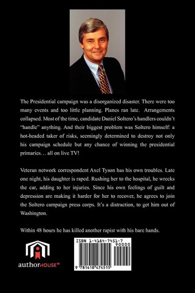 The Presidential campaign was a disorganized disaster. Sound systems failed, planes ran late, arrangements fell through. Most of the time, candidate Daniel Soltero's handlers couldn't "handle" anything. And their biggest problem was Soltero himself: a hot-headed taker of risks, seemingly determined to destroy not only his campaign schedule but any chance of winning the presidential primaries. all on live TV! Veteran network correspondent Axel Tyson has his own troubles. Late one night, his daughter is raped. Rushing her to the hospital, he wrecks the car, adding to her injuries. Since his own feelings of guilt and depression are making it harder for her to recover, he agrees to join the Soltero campaign press corps. It's a distraction, to get him out of Washington. Within 48 hours he has killed another rapist, with his bare hands.