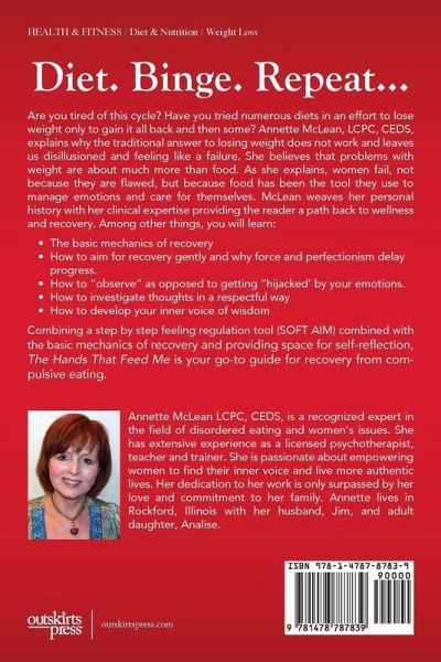 Diet. Binge. Repeat... Are you tired of this cycle? Have you tried numerous diets in an effort to lose weight only to gain it all back and then some? Annette McLean, LCPC, CEDS, explains why the traditional answer to losing weight does not work and leaves us disillusioned and feeling like a failure. She believes that problems with weight are about much more than food. As she explains, women fail, not because they are flawed, but because food has been the tool they use to manage emotions and care for themselves. McLean weaves her personal history with her clinical expertise providing the reader a path back to wellness and recovery. Among other things, you will learn: • The basic mechanics of recovery • How to aim for recovery gently and why force and perfectionism delay progress. • How to "observe" as opposed to getting "hijacked’ by your emotions. • How to investigate thoughts in a respectful way • How to develop your inner voice of wisdom Combining a step by step feeling regulation tool (SOFT AIM) combined with the basic mechanics of recovery and providing space for self-reflection, The Hands That Feed Me is your go-to guide for recovery from compulsive eating.