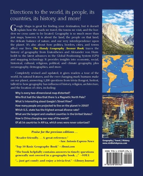 The world, its people, its countries, its history, the maps, and more! Geography is more than just maps and finding your destination. It is about the land, the people on that land, the delicate balance of nature, and our very interdependence upon it, despite the miracles of technology and grocery stores. It's about the effects of nature on places and people, as well as how politics, borders, cities, and towns affect our lives. The Handy Geography Answer Book traces the history of geography from Eratosthenes and Alexander von Humboldt to latitude and longitude, folding maps, and the latest advances in the Global Positioning System (GPS). It provides insights into economic, social, historic, culture, religious, political, and climate geography, plus oceanography, demographics, and more. Completely revised and updated, The Handy Geography Answer Book tours the world, its natural features, and the ever-changing mark humans make on our planet. It answers 1,200 questions on today's world, from the trivia (longest, hottest, tallest) to how geography has influenced history, religion, architecture, and the location of cities. You'll learn answers to such questions as . . . Why is every two-dimensional map distorted? What new epoch has recently been proposed by Nobel Prize winner Paul Crutzen? Who first had the idea that there is a magnetic North Pole? What is interesting about Google's "Streetview"? How does GPS work? When will we run out of oil? How many people are projected to live on the planet in 2050? What are the largest metropolitan areas in the United States? How many miles of paved road are there in the United States? Which state has the highest annual divorce rate? What are the largest and smallest counties in the United States? What's the difference between England, Great Britain, and the United Kingdom? How is China changing our map of the world? What is ISIS/ISIL? Of all 54 countries in Africa, which ones were never colonized? Who owns Antarctica? Numerous maps, photos, and illustrations bring the text to life. With an appendix detailing the history, people, government, economy, climate, geography, and other statistics for each of the more than 250 countries of the world, this is the ideal resource for anyone interested in learning about our planet. The Handy Geography Answer Book also includes a helpful bibliography and an extensive index, adding to its usefulness.