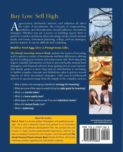Buy Low. Sell High. Build a Nest Egg. Live a Prosperous Life. Appreciation, dividends, interest, and inflation all affect the value of investments. The concepts of compounding, portfolios, and diversification should influence investment strategies. Whether you are a novice or budding expert, there is much to consider and know when investing: stocks, bonds, mutual funds, real estate, retirement planning, college, and tax strategies, just for starters. It can be difficult and confusing. The Handy Investing Answer Book explains the basics of investing, and it explores a variety of investments and their differences, offering tips for avoiding poor returns and unnecessary risk. Most important, it gives valuable information on how to prevent banks, mutual fund managers, and financial advisers from getting rich at your expense. This handy primer provides 1,400 easy-to-understand answers to questions range from the simple to the complex, such as: Why is dollar cost averaging a beneficial strategy for investing? What are some of the steps to establishing the right goals for investing? What is a market index? What is a home equity loan? What types of risks could we see if we own individual stocks? When did mutual funds start? What is laddering? And many, many more! A bibliography and extensive index add to its usefulness. The Handy Investing Answer Book is an up-to-date investing reference book for everyone.