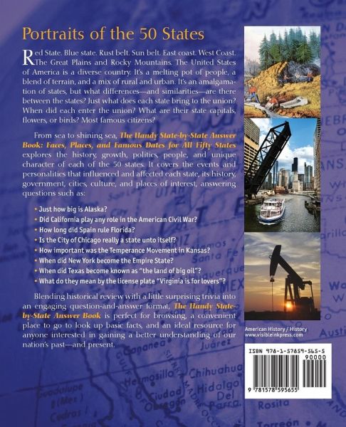 Red State. Blue State. Rust belt. Sun belt. East Coast. West Coast. A look at the state of the 50 states, from Hawaii to New York, and Alabama to Wyoming. An engaging look at each state's history, capitals, flowers, birds, famous citizens and more! How did colonies, territories, and land purchases shape the United States of America? What differences-and similarities-are there between the states? What does each state bring to the union? When did each enter the union? What is their history, culture, and current population, and what might the future bring for each state? From sea to shining sea, The Handy State-by-State Answer Book: Faces, Places, and Famous Dates for all Fifty States explores the history, growth, politics, people, and more of each of the 50 states. It is a resource for learning about the events and personalities that influenced and affected each state, its history, government, cities, and culture. It is a convenient place to look for state facts and trivia. It offers an engaging overview of how a union of states became the U.S.A, the background and history of each of its 50 states, and the current state of each state. In addition to the state motto, nickname, and when it entered the union, The Handy State-by-State Answer Book answers intriguing questions about the people, places, and events thatlend a unique character to each state's boundaries, government, and places of interest, such as: How much natural variety exists within California? How important were-and are-the Beach Boys to the making of California's culture? What is the capital of Hawaii? Are the Hawaiians themselves still in charge of their state and its economy? How many artists, writers, poets, and sculptors have lived in Massachusetts? Why was it so easy for the Pilgrims and the Puritans to take over eastern Massachusetts? Is New York a city? A state? Or a state of mind? How many artists and writers have attempted to do justice to the beauty that exists in New York State? Is Mount Rushmore the place from which to view the accomplishments of the state and its people? Who were the first inhabitants of what we call South Dakota? Is it true that the people of Washington-and, indeed, most of the Pacific Northwest-are more liberal than their East Coast cousins? Is it true that it never stops raining on the Washington coast? Wide-ranging and comprehensive with nearly 140 illustrations, this information-rich tome also includes a helpful bibliography and an extensive index, adding to its usefulness. A perfect companion for history buffs of all ages, The Handy State-by-State Answer Book: Faces, Places, and Famous Dates for all Fifty States is an ideal home reference and a convenient place to go to look up the basic facts and more of each of the 50 states