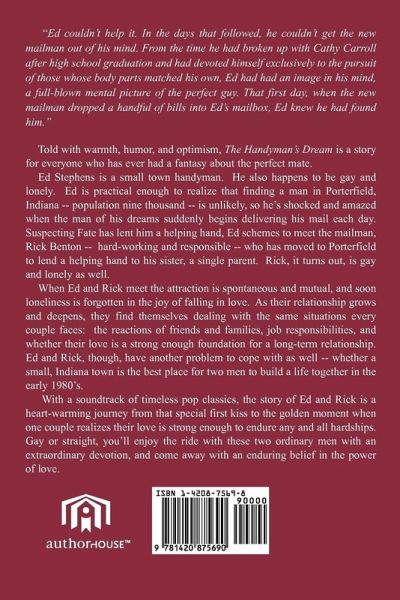 "Ed couldn't help it. In the days that followed, he couldn't get the new mailman out of his mind. From the time he had broken up with Cathy Carroll after high school graduation and had devoted himself exclusively to the pursuit of those whose body parts matched his own, Ed had had an image in his mind, a full-blown mental picture of the perfect guy. That first day, when the new mailman dropped a handful of bills into Ed's mailbox, Ed knew he had found him." Told with warmth, humor, and optimism, The Handyman's Dream is a story for everyone who has ever had a fantasy about the perfect mate. Ed Stephens is a small town handyman. He also happens to be gay and lonely. Ed is practical enough to realize that finding a man in Porterfield, Indiana -- population nine thousand -- is unlikely, so he's shocked and amazed when the man of his dreams suddenly begins delivering his mail each day. Suspecting Fate has lent him a helping hand, Ed schemes to meet the mailman, Rick Benton -- hard-working and responsible -- who has moved to Porterfield to lend a helping hand to his sister, a single parent. Rick, it turns out, is gay and lonely as well. When Ed and Rick meet the attraction is spontaneous and mutual, and soon loneliness is forgotten in the joy of falling in love. As their relationship grows and deepens, they find themselves dealing with the same situations every couple faces: the reactions of friends and families, job responsibilities, and whether their love is a strong enough foundation for a long-term relationship. Ed and Rick, though, have another problem to cope with as well -- whether a small, Indiana town is the best place for two men to build a life together in the early 1980's. With a soundtrack of timeless pop classics, the story of Ed and Rick is a heart-warming journey from that special first kiss to the golden moment when one couple realizes their love is strong enough to endure any and all hardships. Gay or straight, you'll enjoy the ride