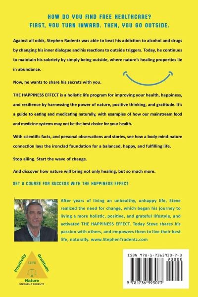 How do you find free healthcare? First, you turn inward. Then, you go outside. Against all odds, Stephen Radentz was able to beat his addiction to alcohol and drugs by changing his inner dialogue and his reactions to outside triggers. Today, he continues to maintain his sobriety by simply being outside, where nature's healing properties lie in abundance. Now, he wants to share his secrets with you. THE HAPPINESS EFFECT is a holistic life program for improving your health, happiness, and resilience by harnessing the power of nature, positive thinking, and gratitude. It's a guide to eating and medicating naturally, with examples of how our mainstream food and medicine systems may not be the best choice for your health. With scientific facts, and personal observations and stories, see how a body-mind-nature connection lays the ironclad foundation for a balanced, happy, and fulfilling life. Stop ailing. Start the wave of change. And discover how nature will bring not only healing, but so much more.