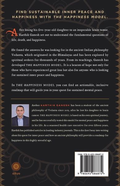 Author Karthik Ganesh has been a student of the ancient philosophy of Vedanta since 2013, after he lost his daughter to brain cancer. The Happiness Model is based on his own spiritual journey, and he has successfully tested this model for mental peace and happiness in his life. As a seasoned health care executive for over fifteen years, Karthik has published articles in leading industry journals. This is his first foray into writing about his quest for inner peace and how an ancient philosophy still provides a roadmap for happiness in this highly stressful age.