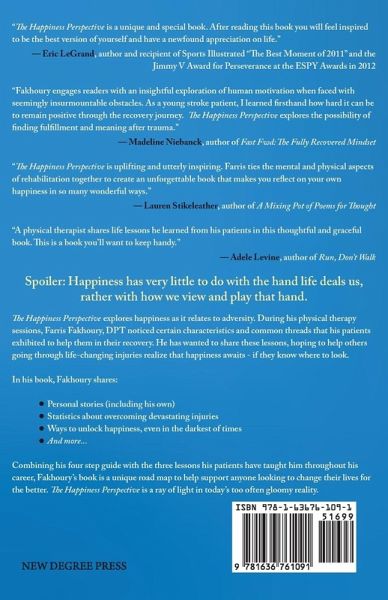 Spoiler: Happiness has very little to do with the hand life deals us, rather with how we view and play that hand. The Happiness Perspective explores happiness as it relates to adversity. During his physical therapy sessions, Farris Fakhoury, DPT noticed certain characteristics and common threads that his patients exhibited to help them in their recovery. He has wanted to share these lessons, hoping to help others going through life-changing injuries realize that happiness awaits - if they know where to look. In his book, Fakhoury shares: Personal stories (including his own) Statistics about overcoming devastating injuries Ways to unlock happiness, even in the darkest of times And more... Combining his four step guide with the three lessons his patients have taught him throughout his career, Fakhoury's book is a unique road map to help support anyone looking to change their lives for the better. The Happiness Perspective is a ray of light in today's too often gloomy reality.