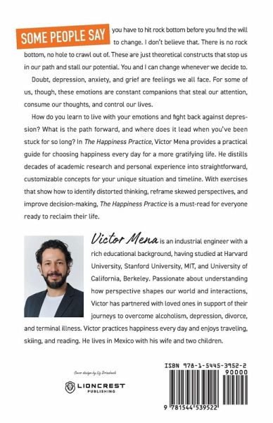 Some people say you have to hit rock bottom before you find the will to change. I don't believe that. There is no rock bottom, no hole to crawl out of. These are just theoretical constructs that stop us in our path and stall our potential. You and I can change whenever we decide to. Doubt, depression, anxiety, and grief are feelings we all face. For some of us, though, these emotions are constant companions that steal our attention, consume our thoughts, and control our lives. ¿ How do you learn to live with your emotions and fight back against depression? What is the path forward, and where does it lead when you've been stuck for so long? In The Happiness Practice, Victor Mena provides a practical guide for choosing happiness every day for a more gratifying life. He distills decades of academic research and personal experience into straightforward, customizable concepts for your unique situation and timeline. With exercises that show how to identify distorted thinking, reframe skewed perspectives, and improve decision-making, The Happiness Practice is a must-read for everyone ready to reclaim their life.