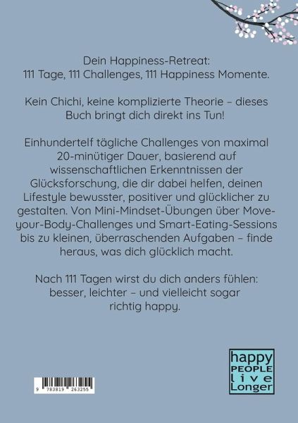 Dein Happiness-Retreat: 111 Tage, 111 Challenges, 111 Happiness Momente. Kein Chichi, keine komplizierte Theorie - dieses Buch bringt dich direkt ins Tun! Einhundertelf tägliche Challenges von maximal 20-minütiger Dauer, basierend auf wissenschaftlichen Erkenntnissen der Glücksforschung, die dir dabei helfen, deinen Lifestyle bewusster, positiver und glücklicher zu gestalten. Von Mini-Mindset-Übungen über Move-your-Body-Challenges und Smart-Eating-Sessions bis zu kleinen, überraschenden Aufgaben - finde heraus, was dich glücklich macht. Nach 111 Tagen wirst du dich anders fühlen: besser, leichter - und vielleicht sogar richtig happy.