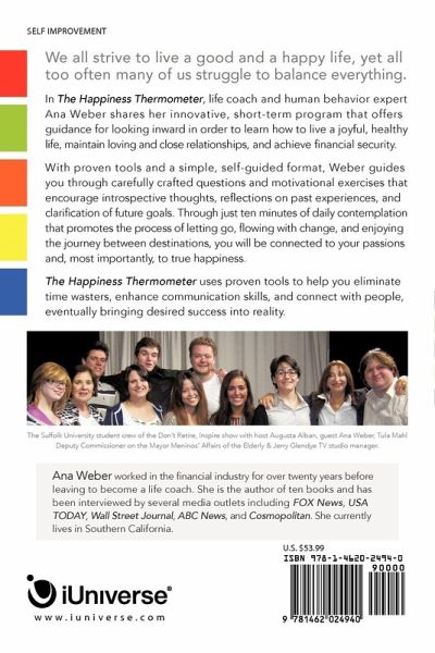 We all strive to live a good and a happy life, yet all too often many of us struggle to balance everything. In The Happiness Thermometer, life coach and human behavior expert Ana Weber shares her innovative, short-term program that offers guidance for looking inward in order to learn how to live a joyful, healthy life, maintain loving and close relationships, and achieve financial security. With proven tools and a simple, self-guided format, Weber guides you through carefully crafted questions and motivational exercises that encourage introspective thoughts, reflections on past experiences, and clarification of future goals. Through just ten minutes of daily contemplation that promotes the process of letting go, flowing with change, and enjoying the journey between destinations, you will be connected to your passions and, most importantly, to true happiness. The Happiness Thermometer uses proven tools to help you eliminate time wasters, enhance communication skills, and connect with people, eventually bringing desired success into reality. "Ana shows all of us how to improve our odds concerning our individual happiness. What if we could actually do something about how happy we are each day? Ana Weber has discovered the secret ..." BOAZ RAUCHWERGER, motivational speaker