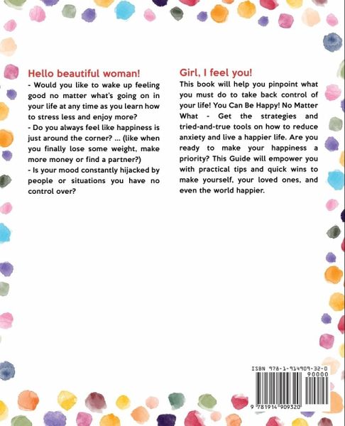 Hello beautiful woman! - Would you like to wake up feeling good no matter what's going on in your life at any time as you learn how to stress less and enjoy more? - Do you always feel like happiness is just around the corner? ... (like when you finally lose some weight, make more money or find a partner?) - Is your mood constantly hijacked by people or situations you have no control over? - Have you achieved a lot of the goals you set for yourself and are left wondering, "Is this it?" Are you ... ? - Struggling with your low moods? - Feeling overwhelmed and over it? - Feeling a sense of malaise and boredom at being so restricted in your activities? - Worried about job security and unemployment? - Dealing with too much togetherness with family or roommates and not enough time with friends? Girl, I feel you! I know what it is like to be in that place of struggle wanting to find your purpose, longing to live a life you love and to truly love yourself but not knowing what steps to take to get there. I used to be that girl too This book will help you pinpoint what you must do to take back control of your life! You Can Be Happy! No Matter What - Get the strategies and tried-and-true tools on how to reduce anxiety and live a happier life But First, a Warning: Before we go further, let me make something abundantly clear: This book does not contain a "magic wand" that will bring you instant relief without having to do any work. What I'm about to share with you takes both time and effort and this only works for those who are willing look deep inside themselves and are committed to finding true happiness. So, with that said, let me tell you... Are you ready to make your happiness a priority? This Guide will empower you with practical tips and quick wins to make yourself, your loved ones, and even the world happier. This Workbook is designed to: - Teach you the principles of happiness that are going to help you access your mental health and well-being all the time. - Help elevate you to a higher mood. - Teach you how to be graceful when low and grateful when high as you become more resilient. - Help you learn how to live presently with a deeper engagement in all you do. - Improve all of your relationships as you become responsive versus reactive to everyone around you. - Teach you the art of mindful living. You'll unlock happiness by learning healthy habits regarding relationships, money, family, kids, social media, trust, fitness, and even buying coffee for strangers. What's Holding You Back? -"I'm afraid of really hearing the truth." My book is designed with YOU in mind, and all of the information is delivered to you in a loving, gentle manner. You will never be put down by me, you will feel confident and supported! - "I'm not ready to do anything just yet. I'll get it when I'm ready to take action." This book doesn't force you to do anything you're not ready to do. You have all the time in the world to complete it, and you do it on your terms and at your speed. I can't promise you that reading to this book is going to be a "total cure", but I can promise that if you APPLY YOURSELF DILIGENTLY, take notes, read and re-read the chapters, you will feel an instant decrease in anxiety within the first couple of days and should see huge improvements within the first week or two. This is not hype, this is what my audience commonly reports!