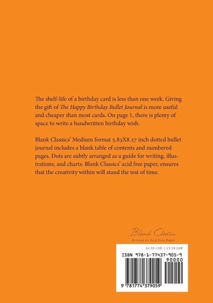 The shelf-life of a birthday card is less than one week. Giving the gift of The Happy Birthday Bullet Journal is more useful and cheaper than most cards. The top of page 1 reads "May your Birthday be Meowgical!" with plenty of space below to write a handwritten birthday wish. Blank Classics' Medium format 5.83X8.27 inch dotted bullet journal includes a blank table of contents and numbered pages. Dots are subtly arranged as a guide for writing, illustrations, and charts. Blank Classics' acid free paper, ensures that the creativity within will stand the test of time.