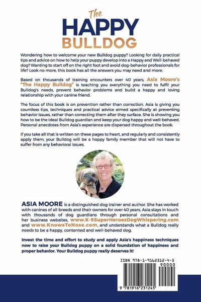 Stop raising your English Bulldog on auto pilot! Help your pup develop into a happy and friendly adult dog. Happiness & behaviour tips and detailed care guidance all in one book! Wondering how to welcome your new English Bulldog puppy? Looking for daily practical tips and advice on how to help your puppy develop into a Happy and Well-behaved dog? Wanting to start off on the right foot and avoid dog-behavior professionals for life? Look no more, this book has all the answers you may need and more. Based on thousands of training encounters over 40 years, Asia Moore's "The Happy English Bulldog" is teaching you everything you need to fulfil your Bulldog's needs, prevent behavior problems and build a happy and loving relationship with your canine friend. The focus of this book is on prevention rather than correction. Asia is giving you countless tips, techniques and practical advice aimed specifically at preventing behavior issues, rather than correcting them after they surface. She is showing you how to be the Ideal Bulldog guardian and keep your dog happy and well-behaved. Personal anecdotes from Asia's experience are dispersed throughout the book. Just a few of the things you will learn:Happiness tips and practical advice How to happily welcome and housebreak your puppy Techniques for a well-behaved Bulldog pup Feeding for puppies and adults, healthy foods and treats Happy exercise requirements Commands, hand signals, tricks, playtime Why you should not treat your puppy as a child Ideal living conditions for a happy Bulldog Daily routines, care and grooming Bulldog body language Keeping on top of your puppy's good health and medical conditions you should watch out for Socialising your pup with people, other dogs and different environments Teaching basic rules and boundaries and offering rewards for the right behaviour How to prevent puppy behaviour issues and avoid dog behaviour experts for life How to provide what your puppy needs to be a contented Bulldog How to be the Ideal Bulldog Guardian Common human mistakes causing unhappiness and behaviour issues & how to avoid them If you take all that is written on these pages to heart, and regularly and consistently apply them, your Bulldog puppy will be a happy family member that will not have to suffer from any behavioral issues. Asia Moore is a distinguished dog trainer and author. She has worked with canines of all breeds and their owners for over 40 years. Asia stays in touch with thousands of dog guardians through personal consultations and her business websites, www.K-9SuperHeroesDogWhispering.com and www.KnowsToNose.com, and understands what a Bulldog really needs to be a happy, contented and well-behaved dog. Asia has written numerous best-selling dog breed books, which have helped countless guardians to understand their dog's needs and live a happier and more fulfilling life together. Invest the time and effort to study and apply Asia's happiness techniques now to raise your Bulldog puppy on a solid foundation of happiness and proper behavior. Your Bulldog puppy really deserves it! Click the BUY NOW button to order your copy of The Happy English Bulldog!
