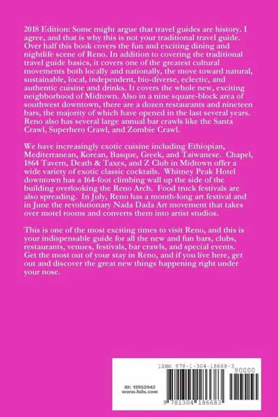2018 Edition: Some might argue that travel guides are history. I agree, and that is why this is not your traditional travel guide. Over half this book covers the fun and exciting dining and nightlife scene of Reno. In addition to covering the traditional travel guide basics, it covers one of the greatest cultural movements both locally and nationally, the move toward natural, sustainable, local, independent, bio-diverse, eclectic, and authentic cuisine and drinks. It covers the whole new, exciting neighborhood of Midtown. Also in a nine square-block area of southwest downtown, there are a dozen restaurants and nineteen bars, the majority of which have opened in the last several years. Reno also has several large annual bar crawls like the Santa Crawl, Superhero Crawl, and Zombie Crawl. This is one of the most exciting times to live in and visit Reno. Get the most out of your stay in Reno, and if you live here, get out and discover the great new things happening right under your nose.