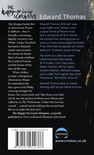 The Morgan family live at Abercorran House in Balham - they're friendly, welcoming, slightly eccentric and Welsh. Arthur Froxfield becomes a frequent visitor and recounts the stories he heard there of swan maidens, the Castle of Leaves and the house of the days of the year. When Arthur revisits a Morganless Abercorran House he remembers the days spent with Philip roaming through the house, the countryside and "that three-acre field which was the garden of Abercorran House and called by us The Wilderness. Under the trees lay a pond ... a pond needs nothing else except boys like us to make the best of it." The Happy-Go-Lucky Morgans, originally published in 1913, is Edward Thomas's only novel. Edward Thomas 1878-1917 was a journalist and literary critic - a close friend of Robert Frost and a champion of W H Davies. He turned from writing prose to poetry in 1914, encouraged by Robert Frost who had recognised an innate poetry in Thomas's prose writing.