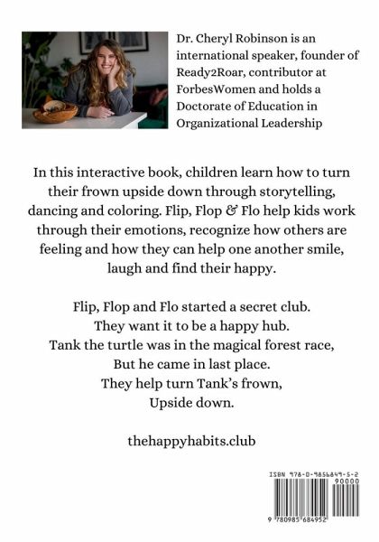 In this interactive book, children learn how to turn their frown upside down through storytelling, dancing and coloring. Flip, Flop & Flo help kids work through their emotions, recognize how others are feeling and how they can help one another smile, laugh and find their happy. Flip, Flop and Flo started a secret club. They want it to be a happy hub. Tank the turtle was in the magical forest race, But he came in last place. They help turn Tank's frown, Upside down.